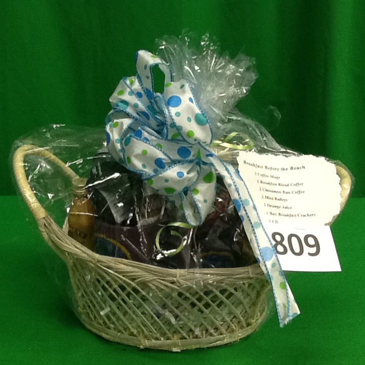 These clever Beach Baskets will have you set from morning to midnight for your next beach vacation. This first basket starts off with breakfast at the beach. With a beautiful sunrise and the beach, just add the coffee. This basket includes: coffee mugs, coffee, Baileys, OJ, breakfast biscuits, and a CD. What an enjoyable way to start the day!