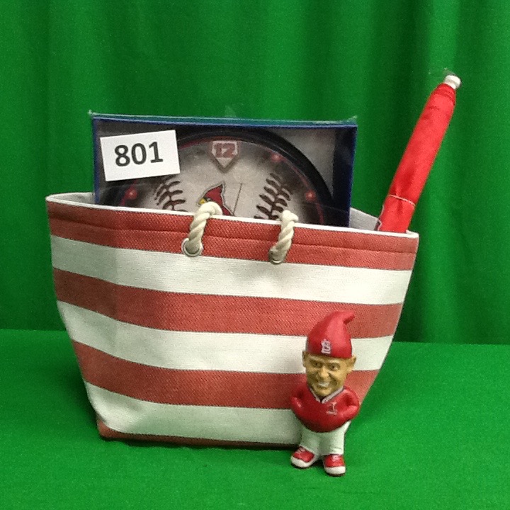 Spice up your home, yard, car, and yourself with Cardinals gear. This package includes a great red and white striped tote filled with Cardinals decor. Bag includes: a "White Rat" garden gnome, Cardinals bottle coozie, Cardinals clock, Cardinals car flag, Cardinals frozen beer mug & a medium ladies fit Cardinals t-shirt.