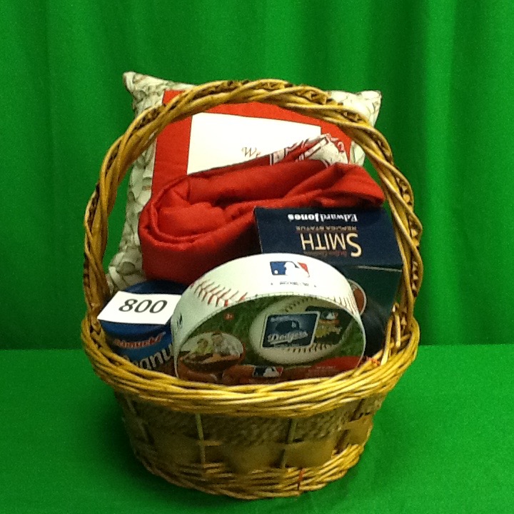 Everything you need for a night in with the St. Louis Cardinals. Basket includes: a Cardinals pillow, Carindals sweatshirt blanket, Ozzie Smith mini statue, MLB matching game, and Schnucks peanuts.